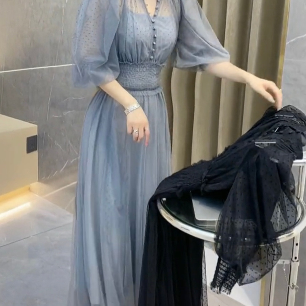 Mesh Tie-dye Printed Off-shoulder Slit Dress Summer INS Fashion Long Dress Party Womens Clothing